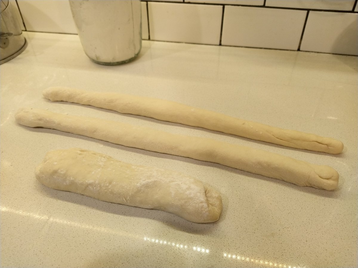 Volvemos a estirar un poco el cilindro con la mano, como cuando hacemos ñoquis o pepas, hasta que cada uno mida alrededor de 40cm de largo.
