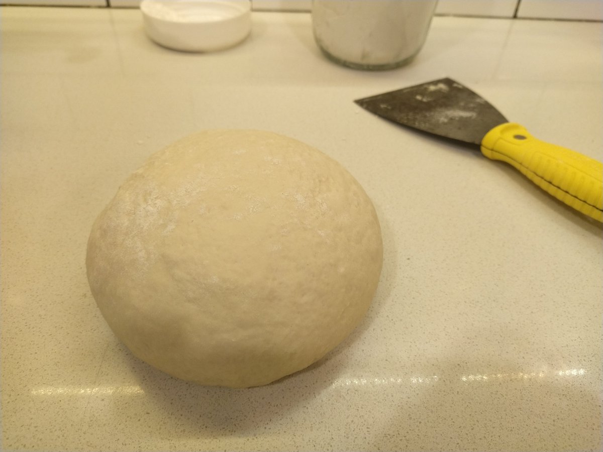 Revolvemos hasta que la masa se despega del bol, y empezamos a amasar un poco pero no mucho. Apenas esté formada la masa paramos.