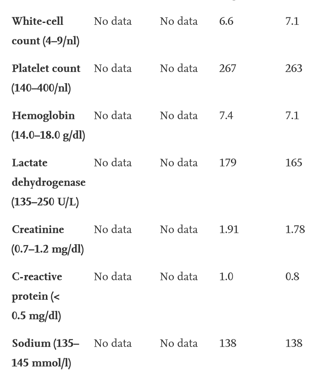 Most telling is the very low hemoglobin, which was never a part of this patient's medical history. This would imply a sudden disregulation of red blood cell generation. A concomitant rise in "free iron" is likely, which can lead to acute infections.