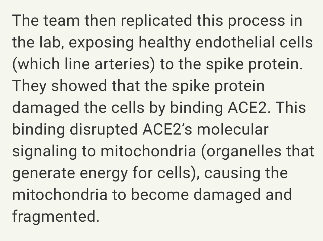 Screenshot 2: "This binding disrupted ACE2’s molecular signaling to mitochondria, causing [them] to become damaged and fragmented."
