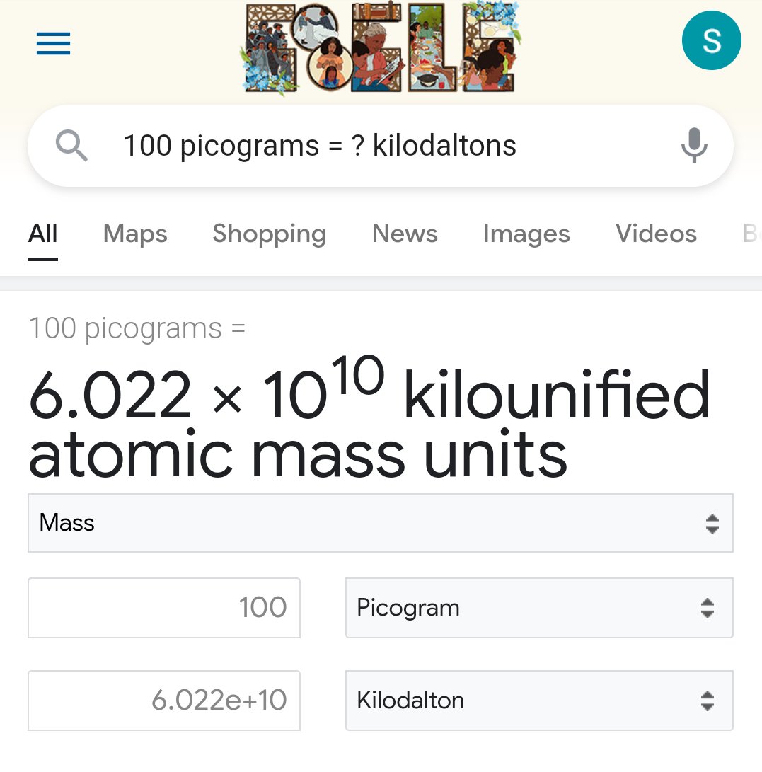 100 pcg is roughly 6 x 10¹⁰ kDa (kilo-Daltons)
