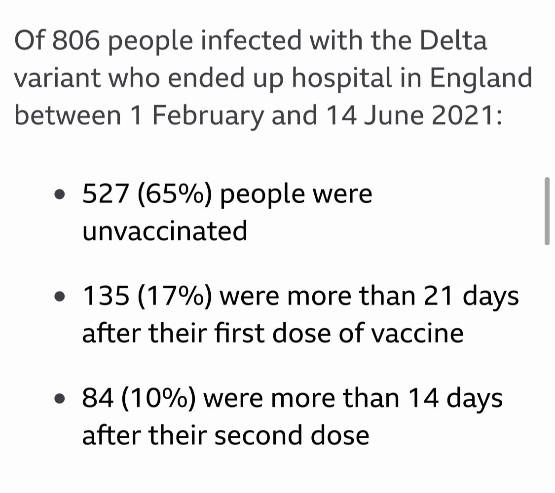 The good news is a single shot reduces the risk of severe disease and hospitalization by as much as >90%, but that still means it’s spreading rapidly in the population, and will drive variant development and hit vulnerable people. Two shots reduces that risk significantly.
