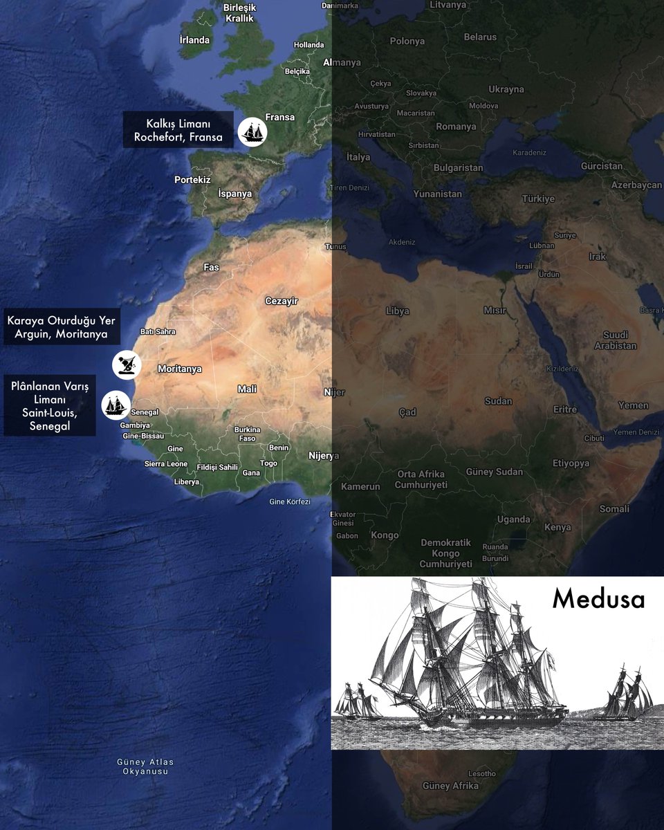 3. Fransız donanmasına ait Medusa isimli fırkateyn, Senegal’e atanan Fransız Vâlisi, diplomatlar, askerler, marangozlar, duvar ustaları, bilimadamları ve sağlık personeli dâhil toplam 400 yolcusuyla birlikte, Fransa’nın Rochefort limanından 17 Haziran 1816 tarihinde yola çıkıyor.