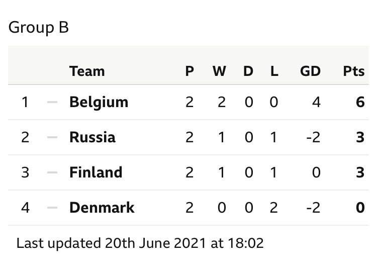 Denmark to beat Russia leaves 3 teams on 3 points and we’ve got our first elimination