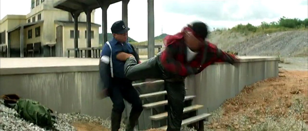...opponent. Another common directing trick: the slow motion kick, which stands out as the highlight of the short action sequence both in terms of filmmaking and athletic performance.