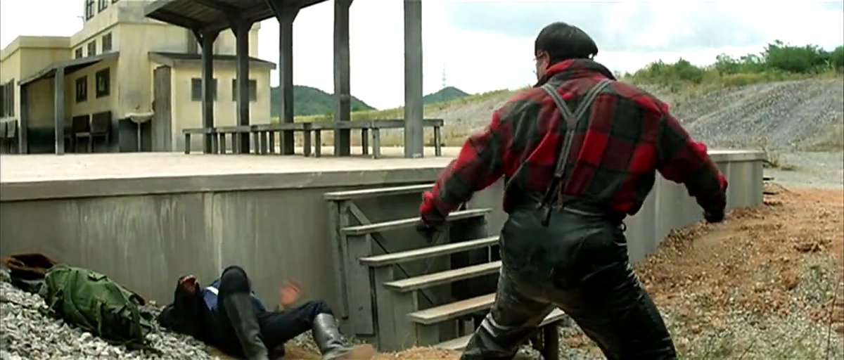 Sammo wants to play with us and what we know populates both genres: face-offs. The shot/reverse-shot trope and its subversion therefore becomes the core component on which the director builds the scene. We start on a visually unusual low-angle vs low ground shot announcing...