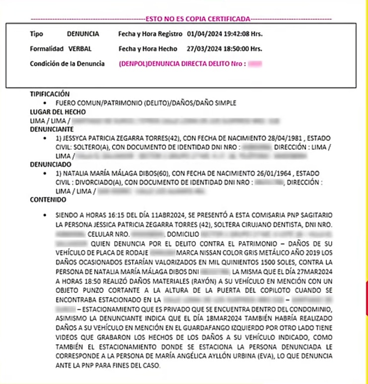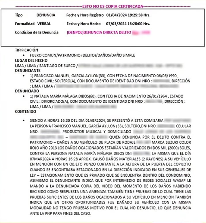 La cosa es así. Un día el carro de Francisco García, hijo de Eva Ayllón, apareció rayado. En los días siguientes volvió a suceder lo mismo. Entonces, decidió poner una cámara. Ahí pudo ver que la persona que estaba atentando contra su vehículo era Natalia Málaga.
