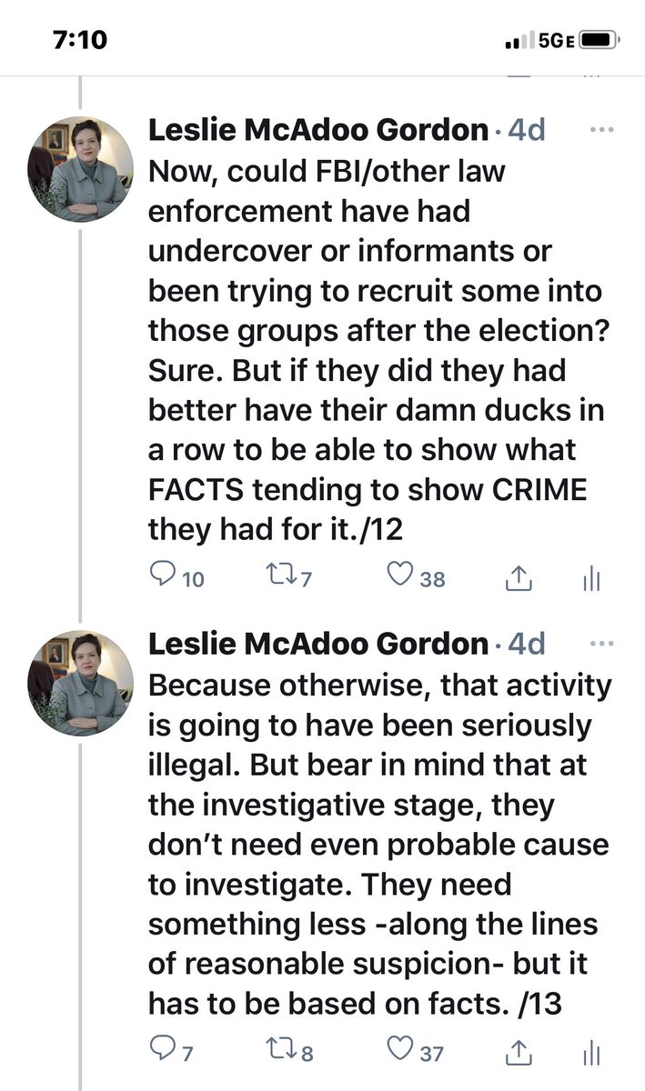 Maybe FBI is investigating/infiltrating groups w/o cause & it hasn’t come to light yet- but that would be illegal, unconstitutional, & contrary to our values. Which is why I said in my thread that if they were/are - they had better have their damn ducks in a row to justify it./10