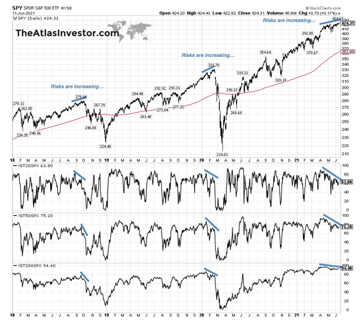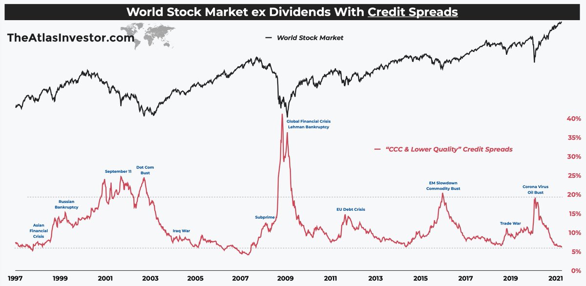 While no indicator is perfect, historically very tight spreads between CCC junk bonds & Treasuries have indicated euphoric sentiment and overbought public securities.
