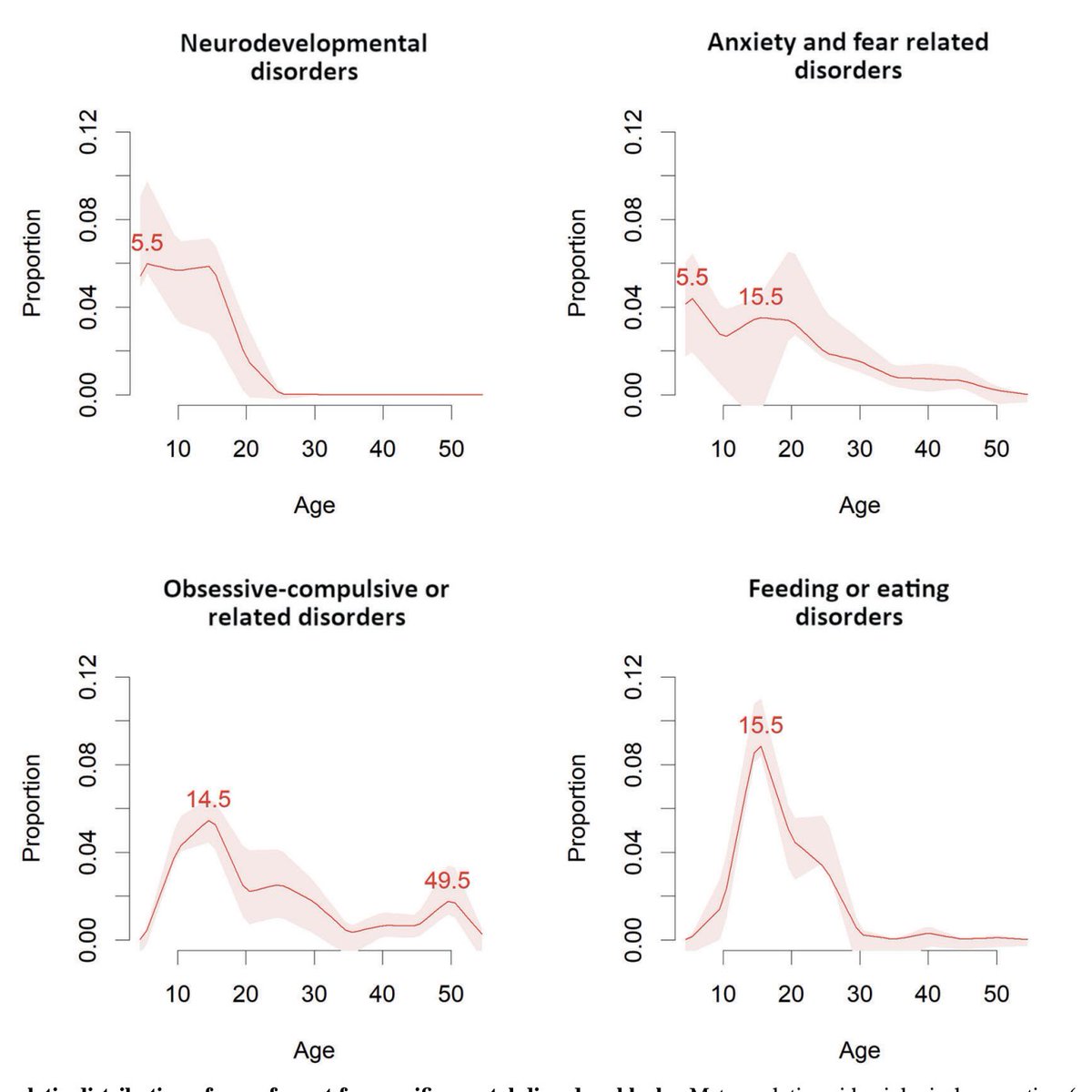 Hier eine Übersicht über die Verteilung des Ersterkrankungsalters für verschiedene Störungsbilder. Zu den „Neurodevelopmental disorders” zählen ADHS und Autismusspektrumsstörungen. 4/8