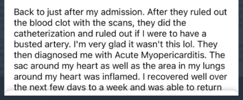 At the bottom of the 3rd screenshot (upper right), she discloses that pulmonary embolism was ruled out, and the final diagnosis was acute myopericarditis.
