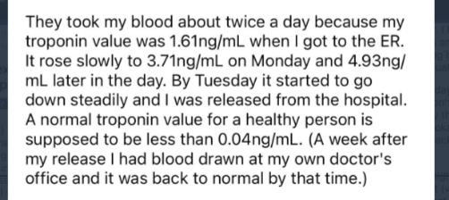 Note the dramatic rise in Troponin. This happens when the heart is injured.