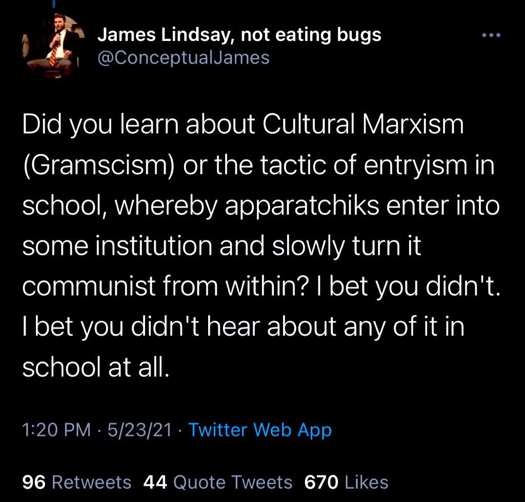 Rufo, like Lindsay, is now incorporating the idea that the (Jewish) Frankfurt School engineered CRT to promote division between White and Black Americans so that they could overthrow White rule and install a Communist government. This is literal neo-Nazism, plain as day.
