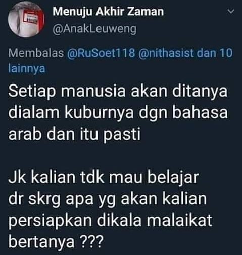 siapa Tuhanmu? Siapa Nabimu? Apa agamamu? Apa kitabmu? dll. Ada sebagian orang yang meyakini bahwa pertanyaan akan disampaikan dengan bahasa Arab.