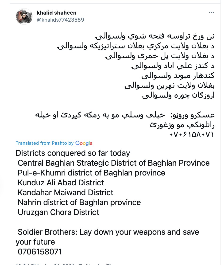 FYI the talibs are on Twitter (TalibTweets?) with phone numbers if you want to surrender. Atta Noor @Atamohammadnoor is also on Twitter calling for a National Mobilization. Talibs are posting booty pics from military camps. Strange days.