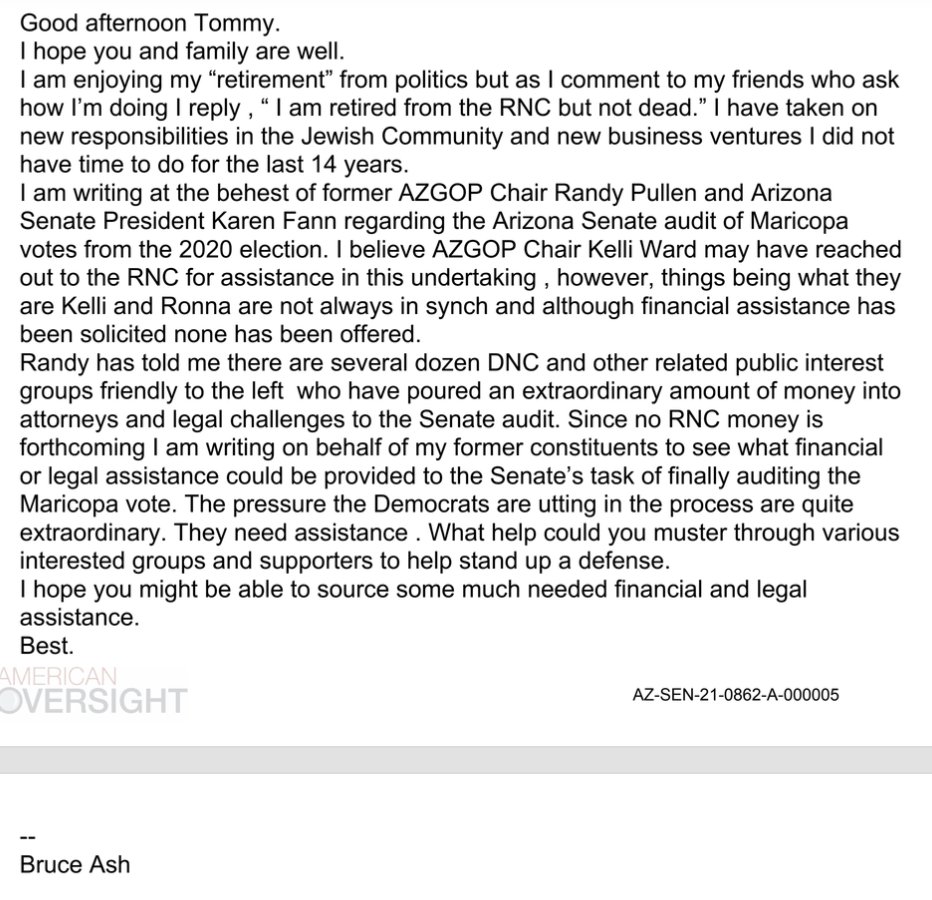 Bruce Ash, the former national committeeman of the AZ Republican Party, forwarded Pullen an email Ash sent to Republican National Committee Co-chair Tommy Hicks essentially asking for RNC funding to defend against challenges to the sham “audit.”