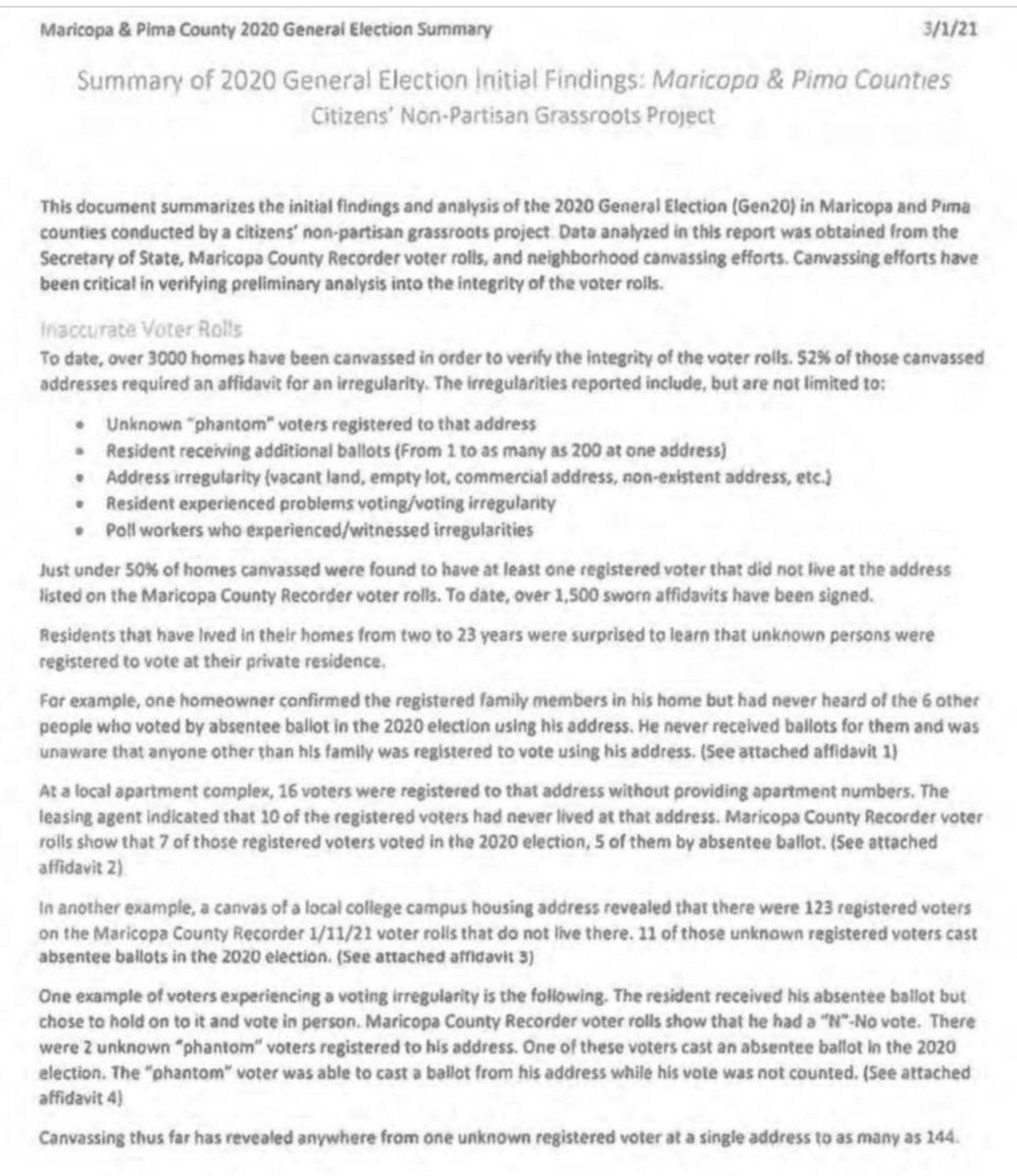 The group, called the Citizen’s Non-Partisan Grassroots Project, put together a report in early March, which we obtained. The report alleges that 52% of the houses canvassed in Maricopa and Pima Counties “required an affidavit for an irregularity.” americanoversight.org/document/arizo…