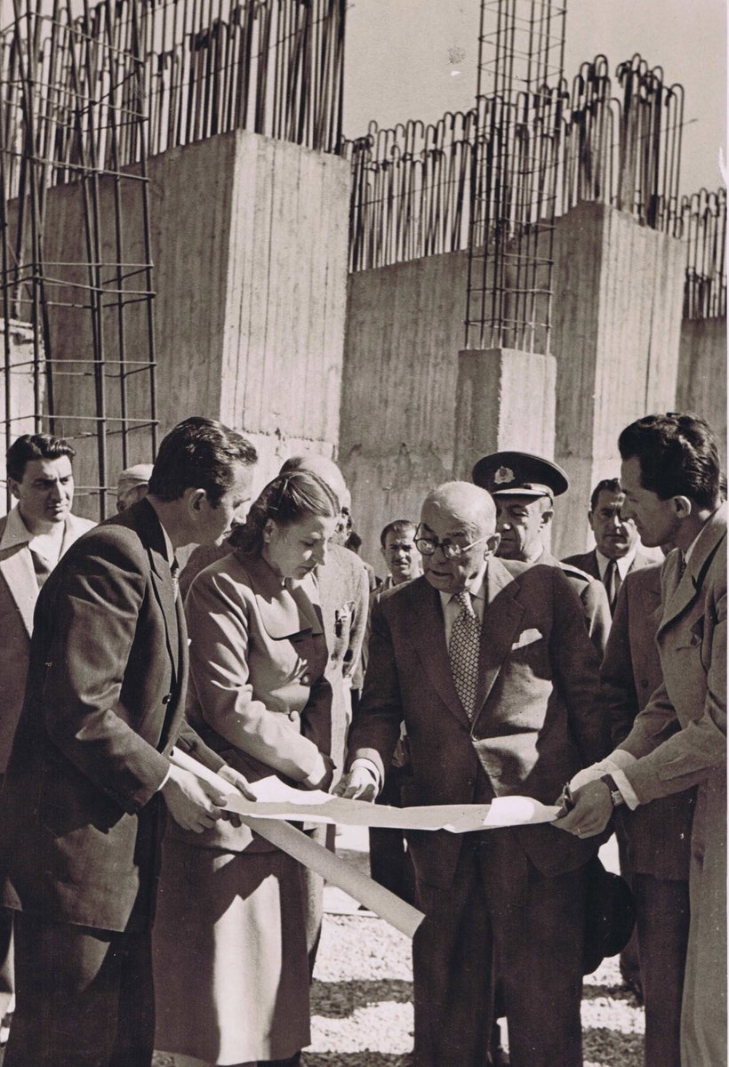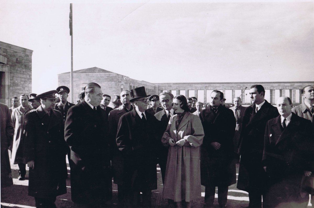 Sabiha Rıfat Gürayman, Anıtkabir maketi önünde dönemin Cumhurbaşkanı Celal Bayar’a bilgi veriyor. Yine bize göre en sağda Anıtkabir’in mimarlarından Prof. Orhan Arda yer alıyor. Anıtkabir’in günümüzdeki mimar müellifi Y. Mimar Ömer Arda sayesinde bu fotoğraflara ulaştık.