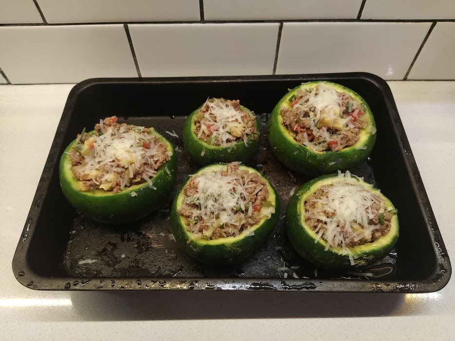 Disponemos los zapallitos en una fuente que vaya al horno (o al hornito eléctrico), y rellenamos y opcional le rallamos queso arriba.