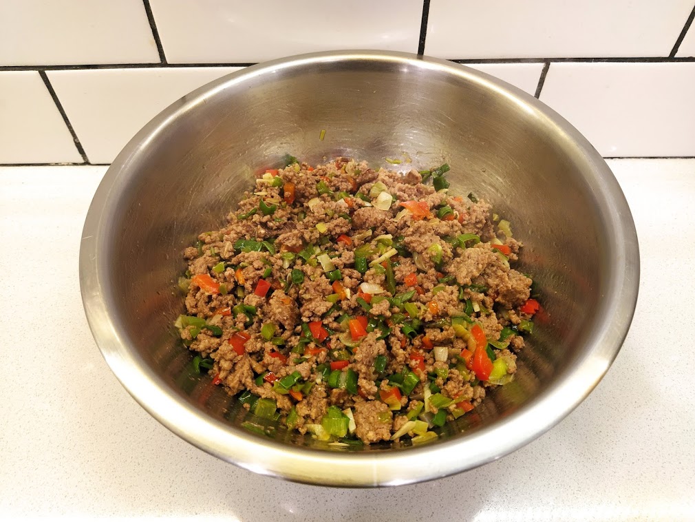 El relleno se hace fácil, primero pican las verduras y las saltean en oliva. Pasan a un bol. Cocinan en la misma sartén la carne picada salando un poco. Una vez cocida juntan con las verduras y agregan chorrito de salsa de soja. Cuando enfrió, el queso picado en cubitos.