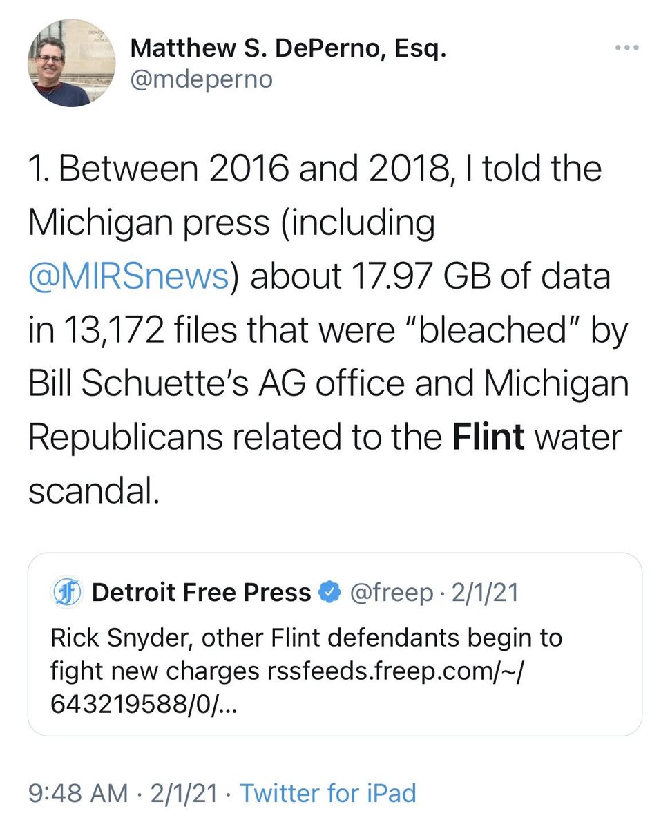 7⃣ The Tenderfoot Club "bleached" 17.97 GB of data in 13,172 files related to the Flint water scandal. They all got away with it. Some got promotions. No charges.