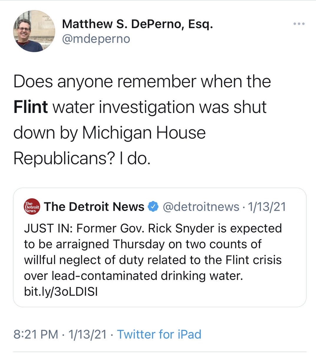 1⃣ @dananessel Remember the Flint Water cover-up designed to shield members of the progressive Democrat-Republican Party, including B. Schuette and R. Snyder?