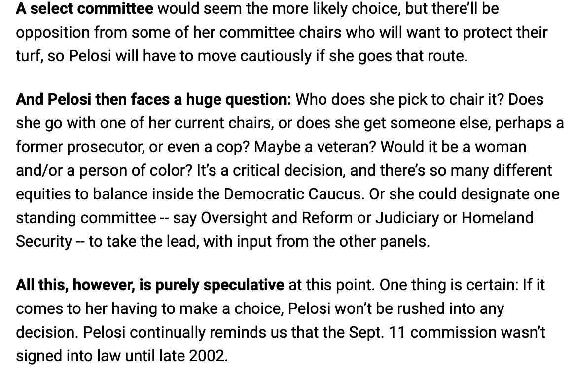 @PunchbowlNews@SenatorCollins Select committee. this is the play that a lot of people want. Pelosi gets to choose who sits on the panel. Lot of control for the speaker here. and would Rs appoint members? Assume so.