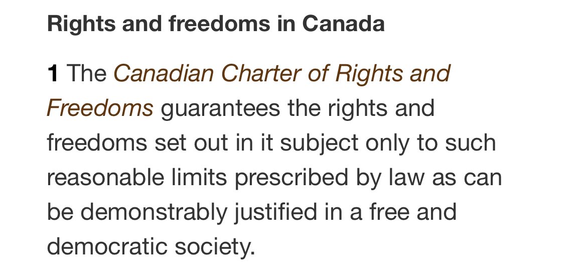 It’s important to consider these provisions together as both directly engage with the limitation of rights under the charter. Section 1 makes clear rights are guaranteed subject to reasonable limits as recognized by free and democratic societies. /2