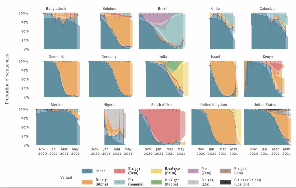 Dos 64 países considerados nesta análise, estimou-se que VOC/VOI sejam a linhagem de circulação mais frequente no último dia de dados disponíveis em 52 países (3 de Junho), sendo as variantes mais comuns Alfa (40 países) e Delta (Índia, Cingapura, Reino Unido e Austrália)