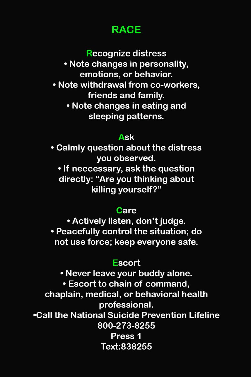 2/ The acronym ACE (Ask, Care, Escort)or RACE for the Marine Corps (Recognize , Ask, Care, Escort) summarizes the steps to take an active & valuable role in suicide prevention.