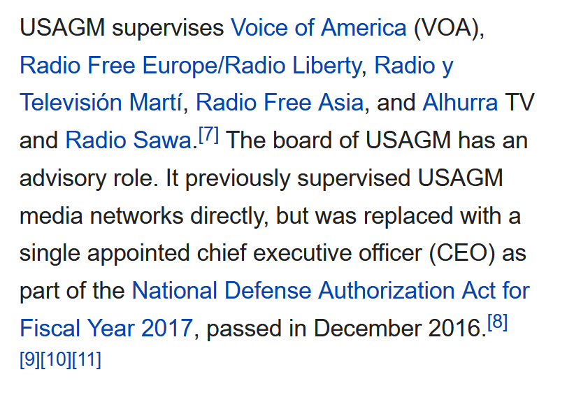 @MonsieursGhost@codyave In December 2016, the BBG was stripped of its control over VOA, Radio Free Europe & other channels meant to support democracy & American's interests. Then renamed the Agency for Global Media. en.wikipedia.org/wiki/U.S._Agen…
