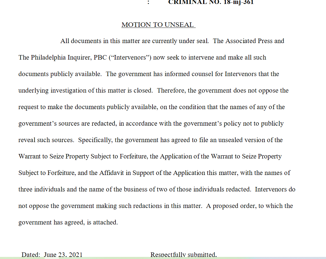Apparently @AP & @PhillyInquirer intervened in the court case on Wednesday to request the case be unsealed. So the DOJ agreed to the unsealing with the protection of source identities with Person 1-3 replacing their real names.