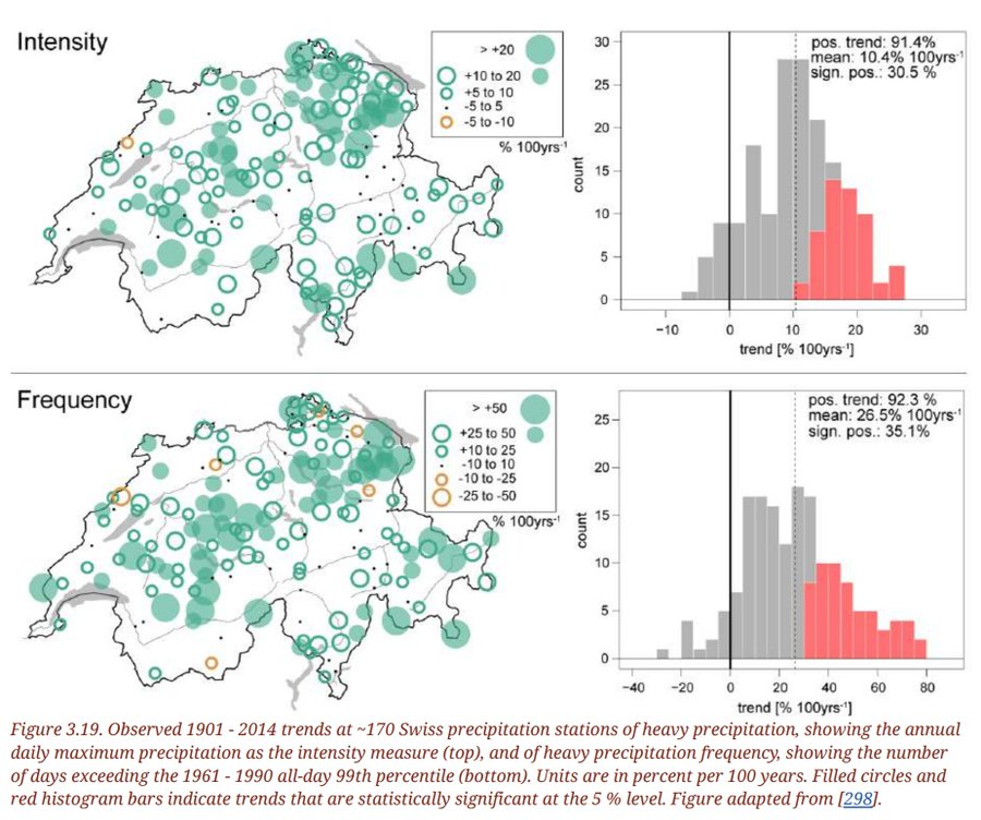 7/ Heute ist das praktisch überall in den Daten sichtbar. In der Schweiz nehmen die Starkniederschläge in Häufigkeit und Intensität an fast allen Stationen zu. nccs.admin.ch/nccs/en/home/c…