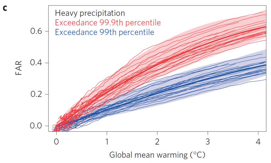 9/ Global zeigen die Modelle, dass die Häufigkeit des heute "nässesten Tages in ~3 Jahren" mit einer Erwärmung von 3°C sich etwa verdoppelt.