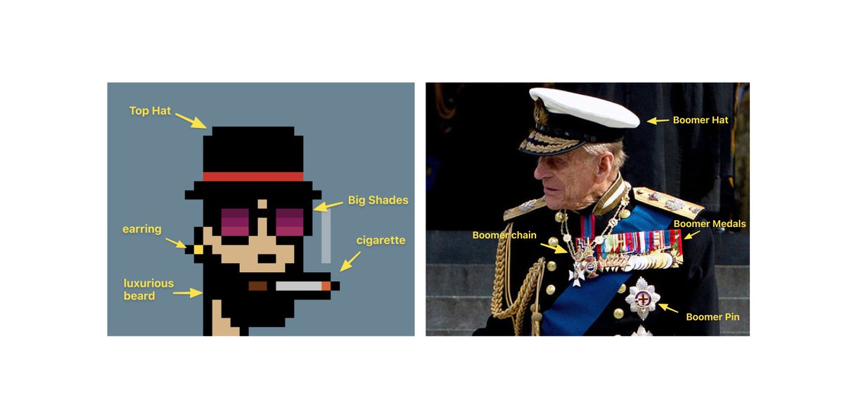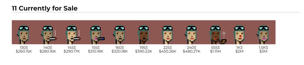 *Within* the army, NFTAs have a status hierarchy based on the increasing rarity of attributes of a character. In the punk army, "pilot helmets" were an attribute that recently begun accruing value. The last sale for a punk with a pilot helmet was 138Ξ (~$280k).