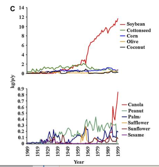 Consumption of seed oils increased massively in the 20th century, soybean oil in particular since the 1970s.
