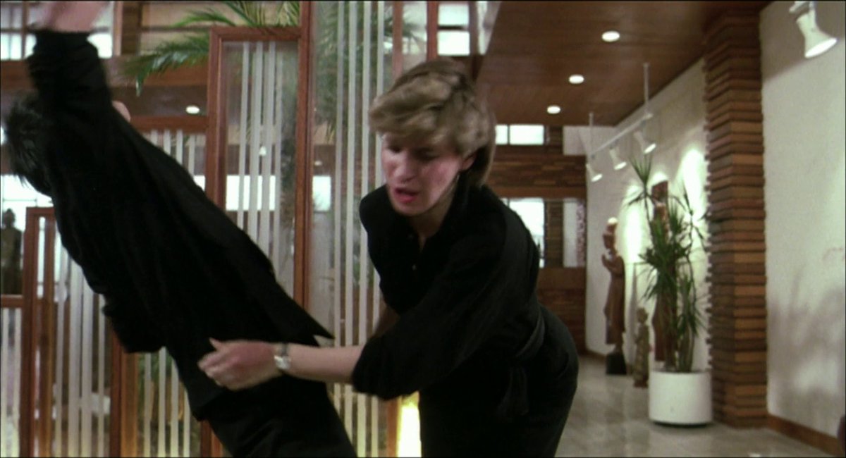 The visual phrase dedicated to Cynthia Rothrock's fight ends with her impressive back kick to Dick Wei's face. With Corey Yuen, when a visual phrase ends, contrast is used to kick-start the following one. We left Cynthia on a horizontal slo-mo shot, meaning we jump to Michelle...