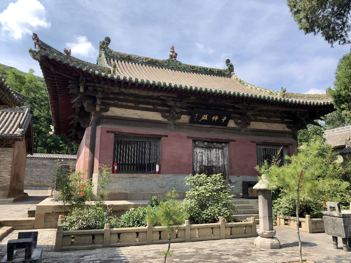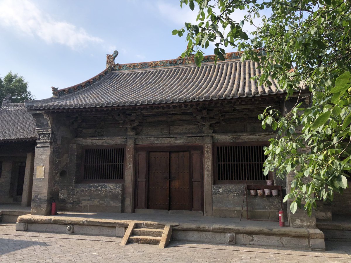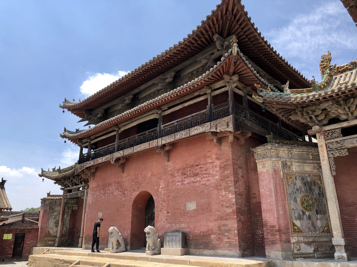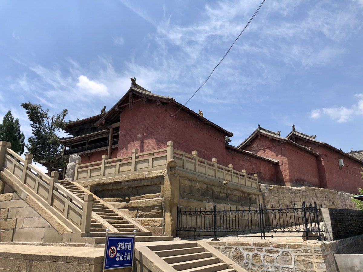 But onwards! I stagger out into sunlight. Helped by @xujnx’s database, next door we find 12th century Jin temple - closed for lunch - but with its massive red-painted entrance and huge Tang masonry base giving a sense of scale.