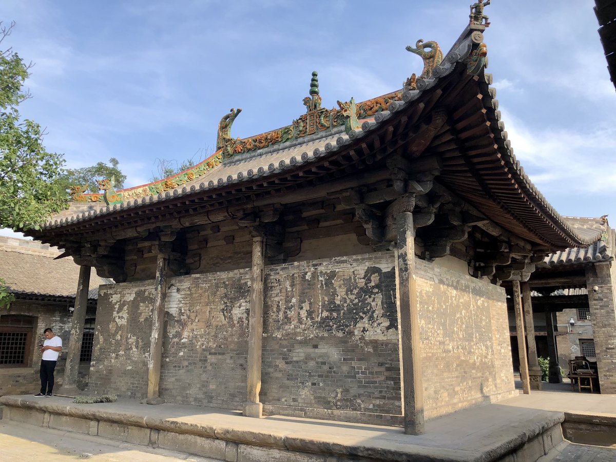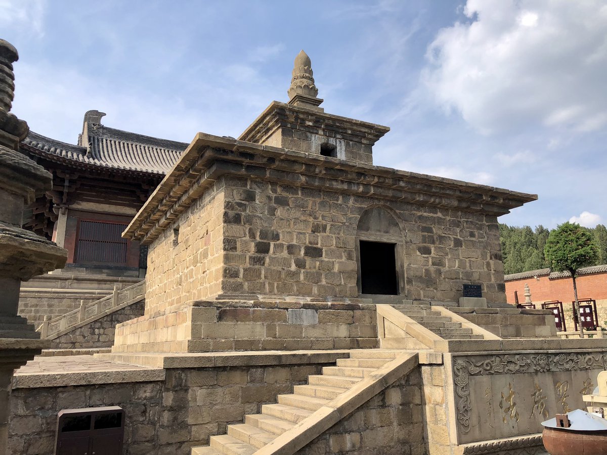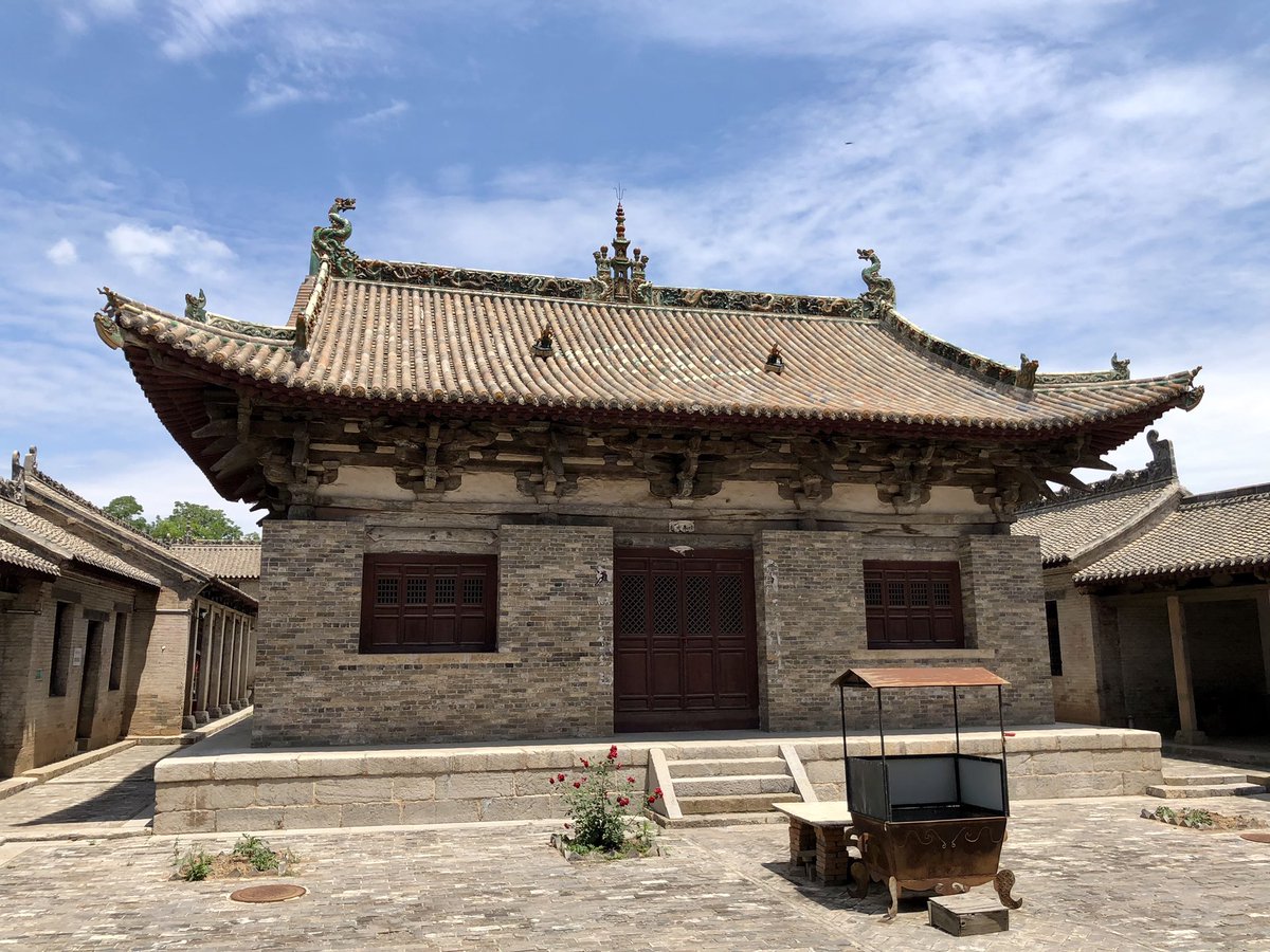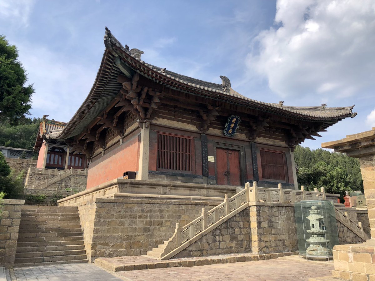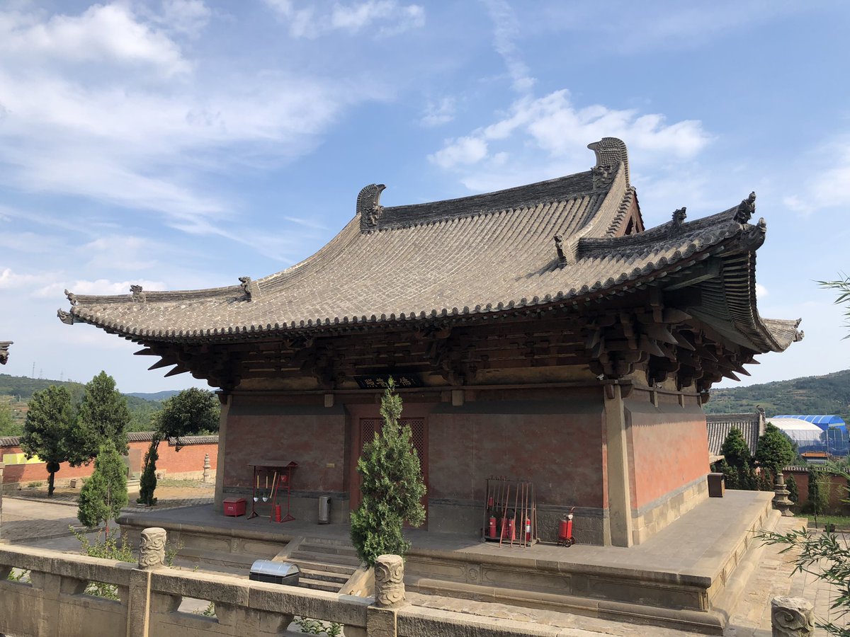 But onwards! I stagger out into sunlight. Helped by @xujnx’s database, next door we find 12th century Jin temple - closed for lunch - but with its massive red-painted entrance and huge Tang masonry base giving a sense of scale.
