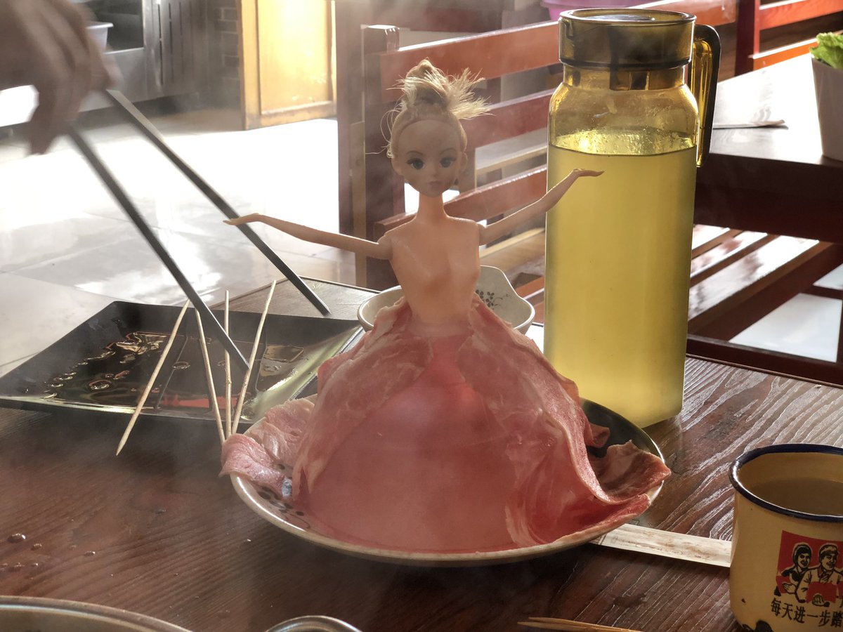 In fit of hospitality Mr Li decides to treat me - to hotpot with endless steam of every kind of meat (and remarkably served on slowly stripped Barbie dolls….), and two bottles of 48% proof Guizhou baijiu.