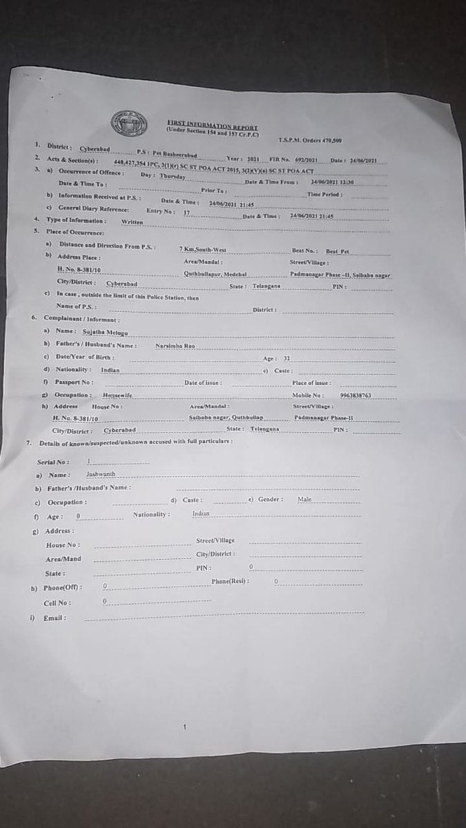 This is the copy of FIR No 692 of 2021 registered by the Per Basheerbad police station on the recent attack on the SC family on 24/06/2022. At least now police should arrest the accused real estate Mafia to prevent further attacks on the SC family