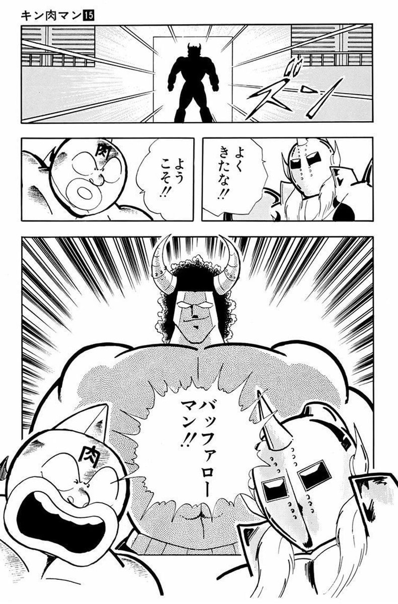 Even worse, by beating the Ashura Buster, Kinnikuman has shown how his own Kinniku Buster can be nullified. He needs a new finishing move! To buy him time, Buffaloman officially switches sides and takes on Akuma Shogun, revealing his hairless head in the process!