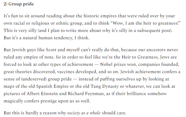 10/Anyway, the second reason people care about Jewish achievement is that it gives some Jewish folks a reason to feel group pride.