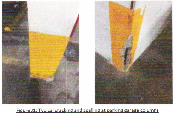 the report discusses spalling and cracking in the support columns in the garage, which presumably helped support the rest of the building. but the text basically says "yeah this needs to be repaired or it'll just get worse" and mentions nothing about structural integrity.