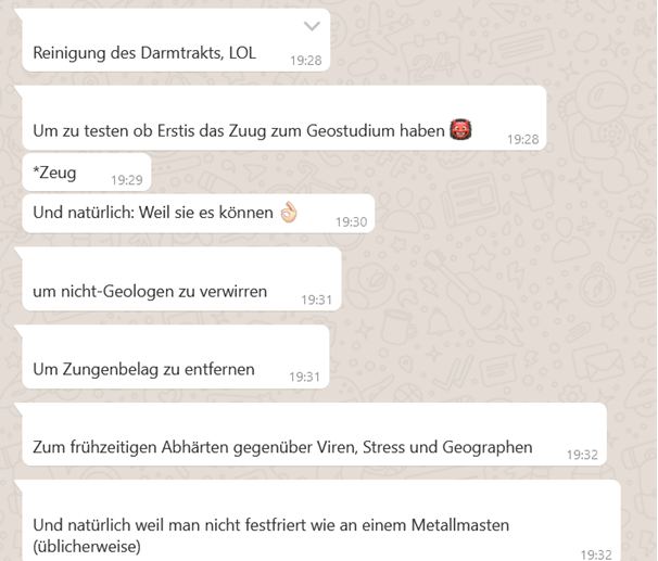 Als ich in einer Gruppe voller Geologen mal alle Gründe zusammentragen wollte, warum man an Steinen leckt, habe ich übrigens zum Teil SEHR hilfreiche Antworten bekommen 😅