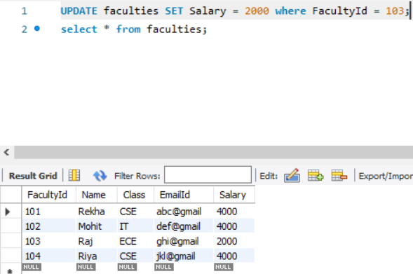 We have columns as FacultyId, Name, Class, EmailId and Salary.