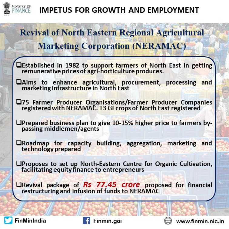✅Revival of North Eastern Regional Agricultural Marketing Corporation (NERAMAC) with package of Rs 77.45 crore