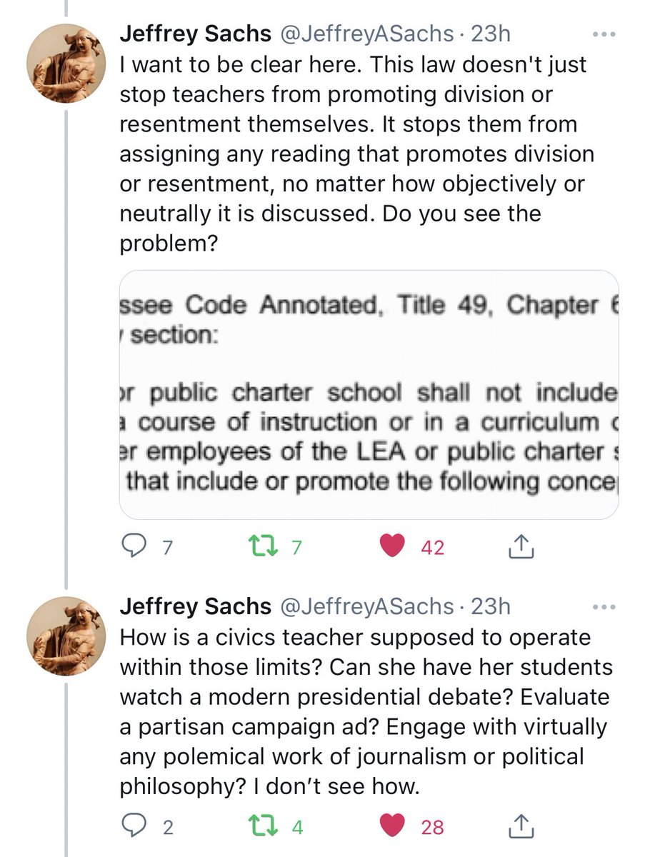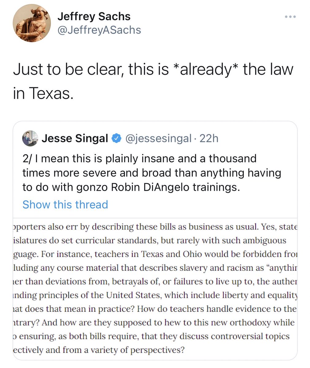 Highly recommend reading through @JeffreyASachs’ whole thread. His essays in @ArcDigi breaking down the awful legislative proposals in which the CRT moral panic has culminated are all fantastic. Essential reading for our times