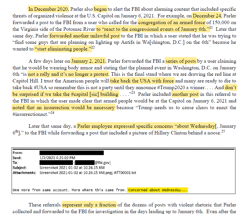 Parler says "formalized the relationship with the FBI" and in December "began to alert the FBI about alarming content that included specific threats of organized violence at the U.S. Capitol on" 1/6.