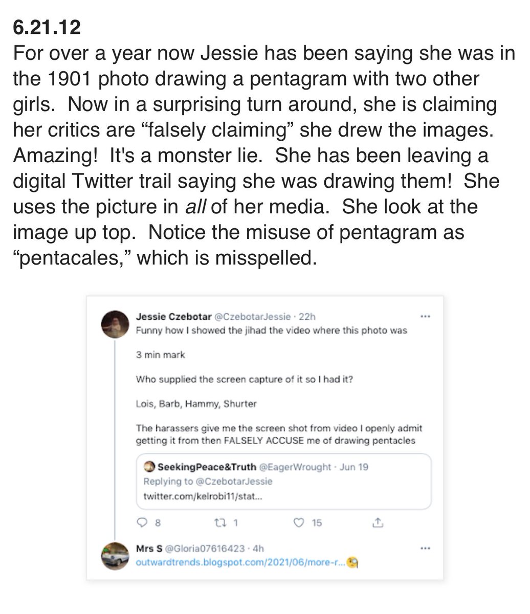“She has shown through her internet posts and videos to be expert at propaganda, psyops, projection, false shaming, accusations with no proof and intense lying against Jessie Czebotar critics to the point of being irrational. (Examples of that below.)” (See blog)